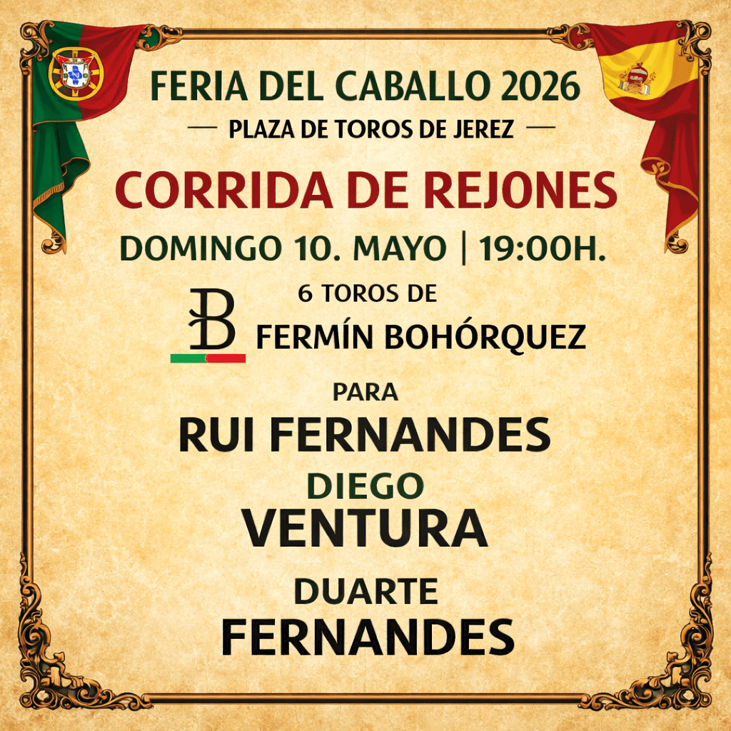 El cartel reúne a tres figuras destacadas del rejoneo: Rui Fernandes, Diego Ventura y Duarte Fernandes, quienes ofrecerán una tarde llena de elegancia, técnica y conexión con el público en un escenario de gran tradición taurina como es Jerez.