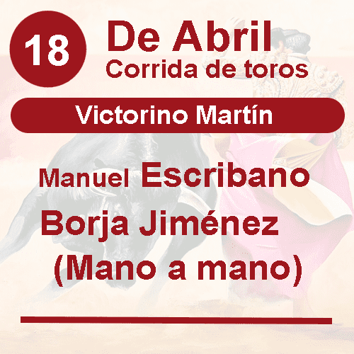 Compra tus entradas para la corrida del sábado 18 de abril en Sevilla. Manuel Escribano y Borja Jiménez se enfrentarán a toros de Victorino Martín en la Real Maestranza durante la Feria de Abril.