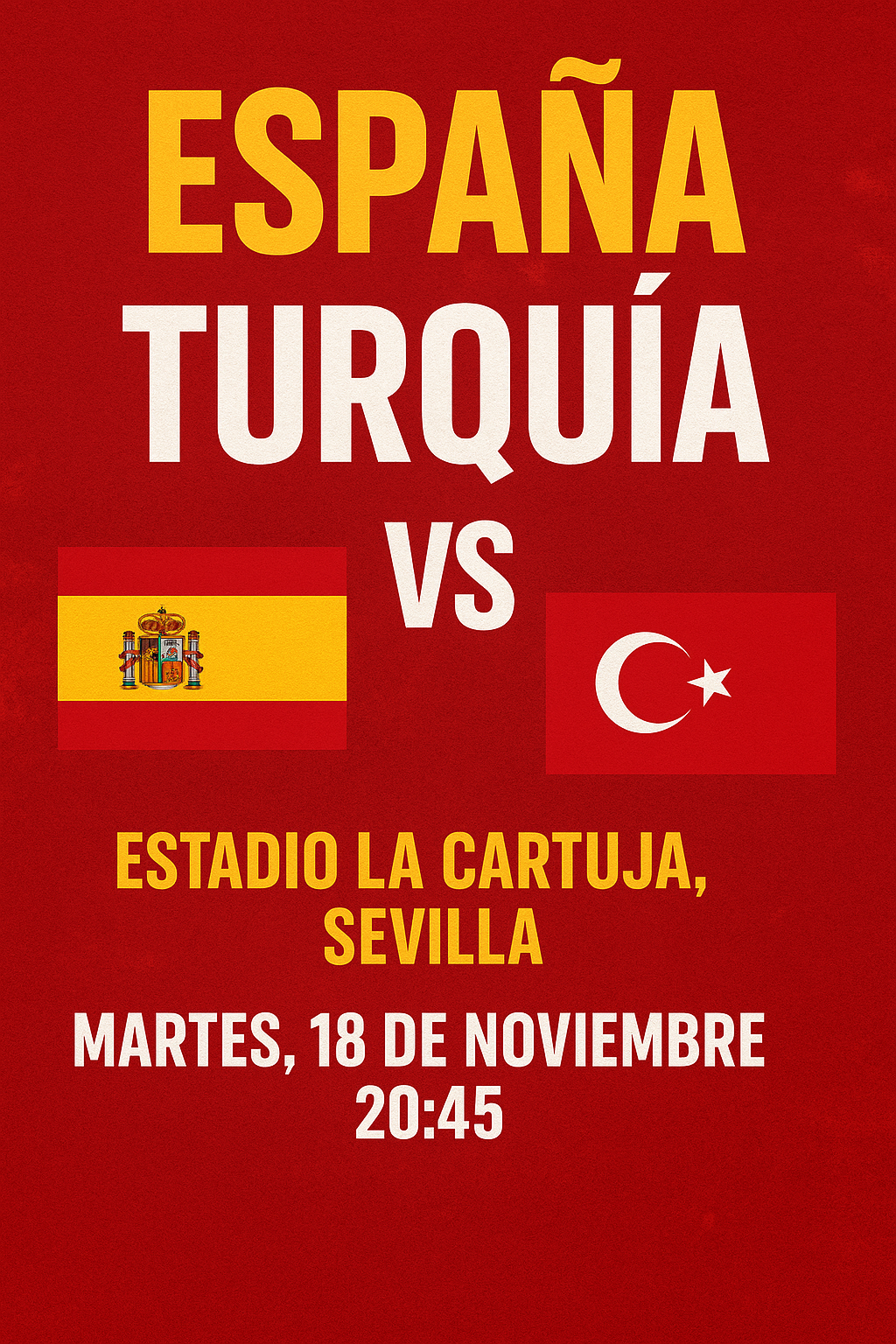La Selección Española de Fútbol jugará el próximo martes 18 de noviembre a las 20:45 horas en el Estadio de La Cartuja (Sevilla) frente a Turquía, en un encuentro valedero para la clasificación al Mundial 2026.